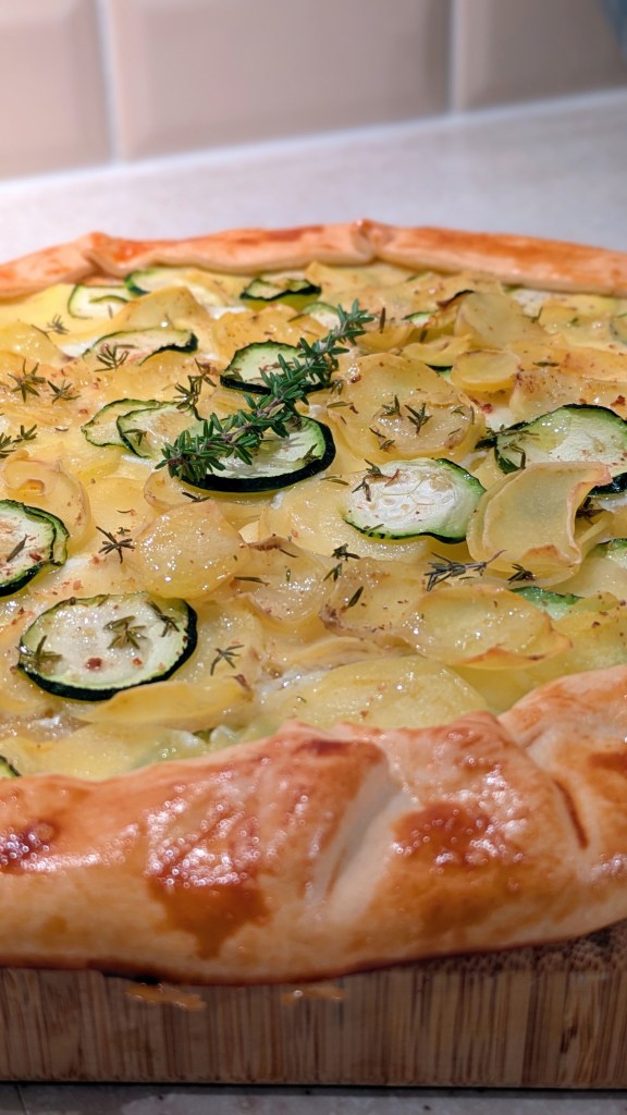 Oubliez les moules compliqués et les fonds de tarte fragiles ! Le charme de cette recette réside dans son côté « fait-maison » et son allure rustique si photogénique. La douceur de la pomme de terre, le croquant léger de la courgette, et le caractère acidulé du chèvre frais se marient à merveille, le tout réchauffé par les notes herbacées du thym.