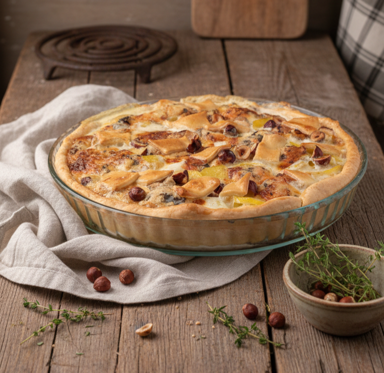 Avis aux rescapés de la semaine : le week-end pointe enfin le bout de son nez, et il mérite mieux qu’un vieux yaourt périmé ! Pour fêter ça, on sort l’artillerie lourde avec cette tarte à la Fourme d’Ambert qui va faire swinguer vos papilles. C’est le mariage parfait entre la patate réconfortante et le fromage bleu qui a du caractère (un peu comme votre patron, mais en bien meilleur). On ajoute des noisettes pour le croquant, parce qu’on est des gens raffinés, et on enfourne le tout. C’est chaud, c’est fondant, et c’est surtout l’excuse idéale pour déboucher une petite bouteille avant samedi. Allez, aux fourneaux, la liberté n’attend pas !