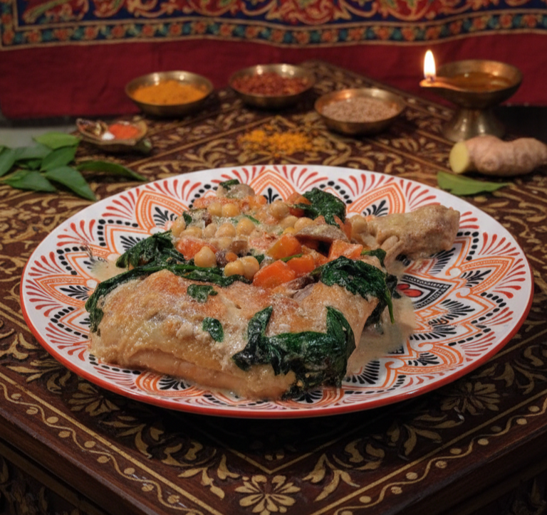 Ingrédients pour 6 personnes : 1 poulet fermier coupé en morceaux – 400 g de pousses d’épinards – 250 g de petits champignons bruns – 2 carottes – 1 oignon- 40 cl de lait écrémé – 500 g de pois chiches cuits au naturel – 40 cl de crème de coco – 1 c. à soupe bombée de ghee – 1 c. à soupe de fenugrec en poudre – Sel et poivre.