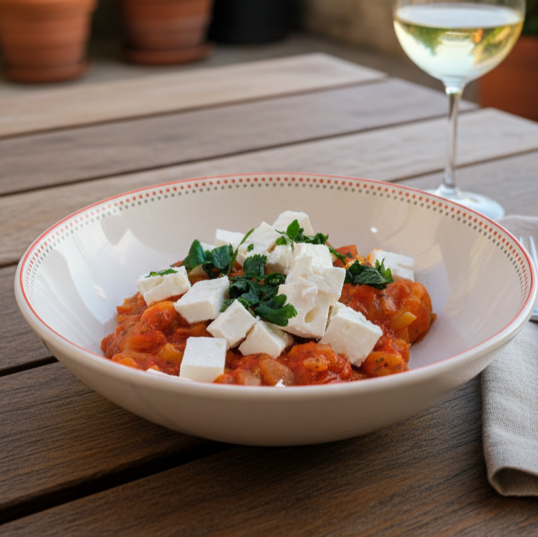Ingrédients pour 4 personnes : 300 g de crevettes – 1 oignon -100 g de fêta – 400 de sauce tomate aux olives – 1 pincée de paprika – Huile d’olive – Sel et poivre.