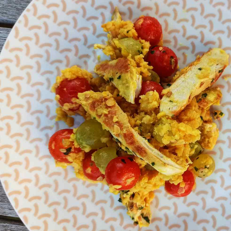 Salade de lentilles corail, poulet , raisins
