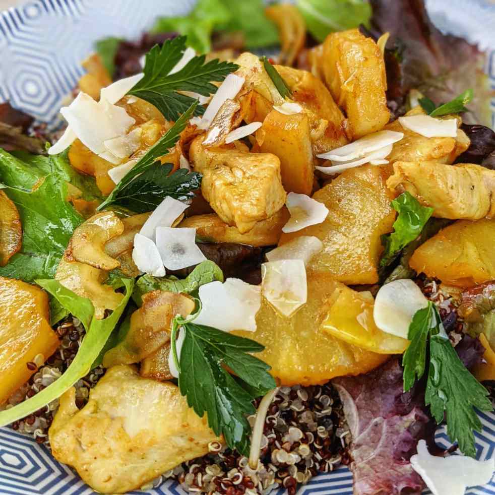Voici une recette qui c'était égarée dans les méandres du blog et qui attendait sagement sa publication depuis le 30 Août (d'ou son coté "estival"). Rien qui ne soit pas de saison, à moins qu'il y ait une saison pour le quinoa ou les chips de noix de coco ?, donc une belle idée pour… Lire la suite Salade poulet et quinoa, ananas