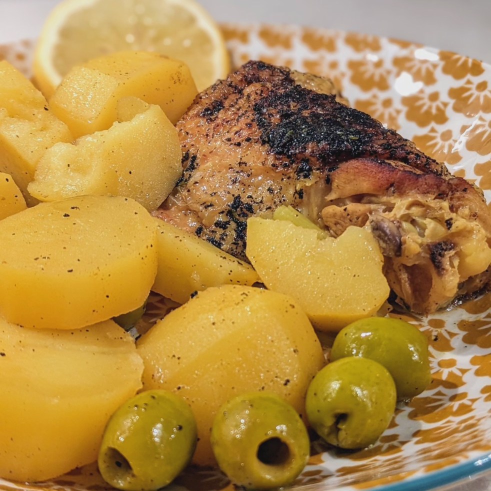 Poulet mariné au citron, pommes de terre et olives.