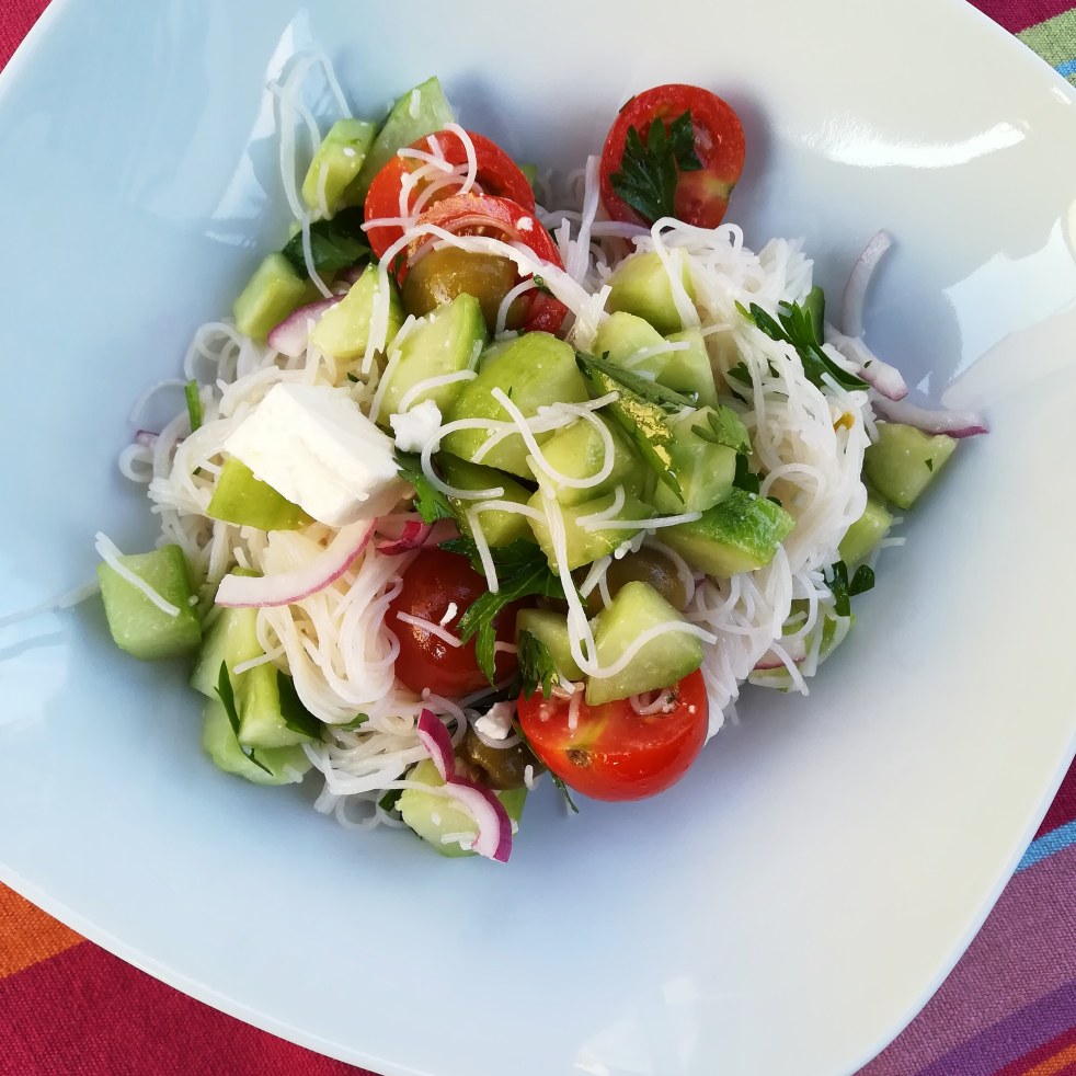 Vous connaissez tous la salade grecque et bien en voici une déclinaison avec une pointe d'Asie grâce aux vermicelles de riz (tout léger), vous les trouverez facilement dans tous les rayons "monde" des supermarchés. Cette salade se suffit largement a elle même pour un repas et donc à ceux qui ne mangent pas de viande.… Lire la suite Salade « grecque » et Asie