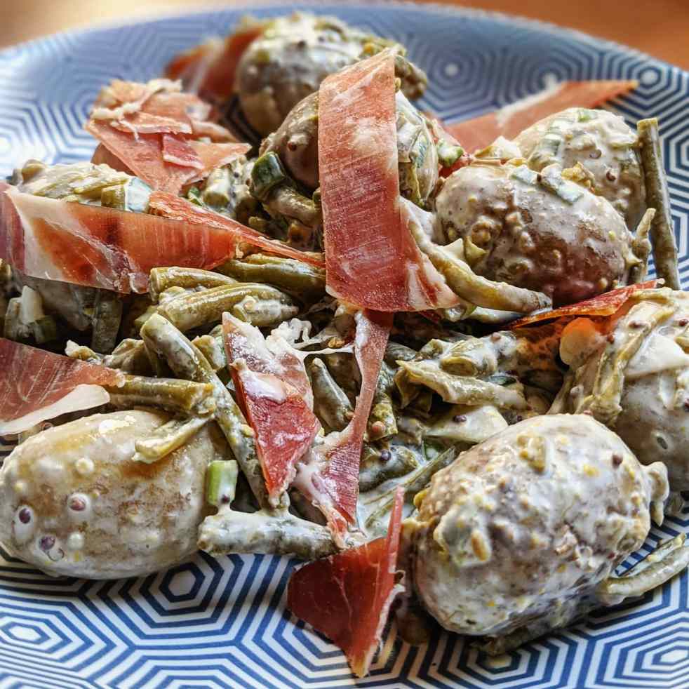 Salade de pommes de terre, jambon cru et haricots verts