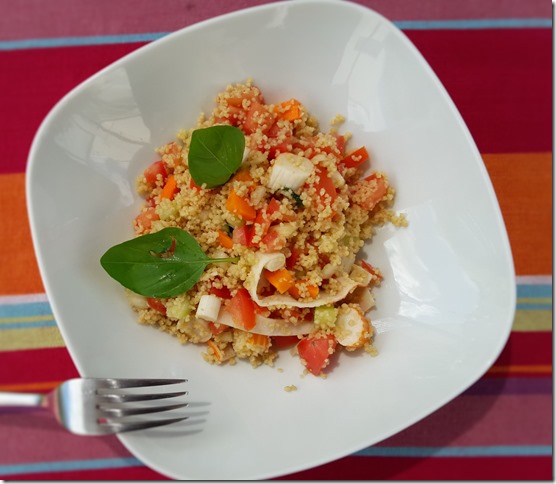 Saison oblige, la semaine commence par une salade qui ressemble fortement à un taboulé. J’utilise rarement du surimi donc quand c’est le cas autant en prendre un qui contienne du vrai poisson et des ingrédients naturels. Pour un saveur moins piquante vous pouvez utiliser du citron vert. Ingrédients pour 4 personnes : 120 g de… Lire la suite Salade de semoule au surimi
